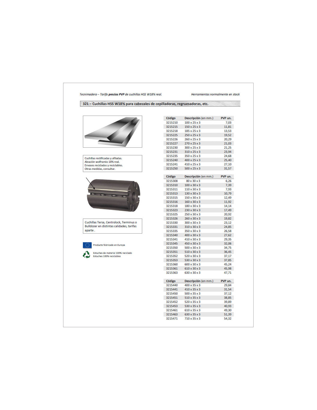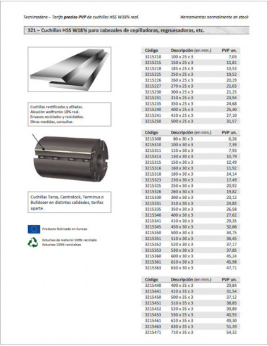 Catálogos actuales Tarifa PVP 2025 - Cuchillas cepilladora sistema Tersa Catálogo tarifa PVP de cuchillas para cepilladora sistema Tersa en HSS (W18%), M-42, y MD (HM) Ver