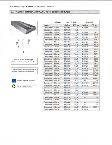 Catálogos actuales Tarifa PVP 2025 - Cuchillas cepilladora sistema Tersa Catálogo tarifa PVP de cuchillas para cepilladora sistema Tersa en HSS (W18%), M-42, y MD (HM) Ver