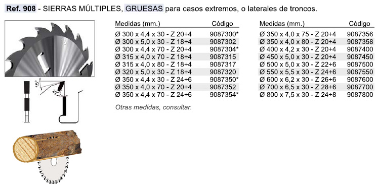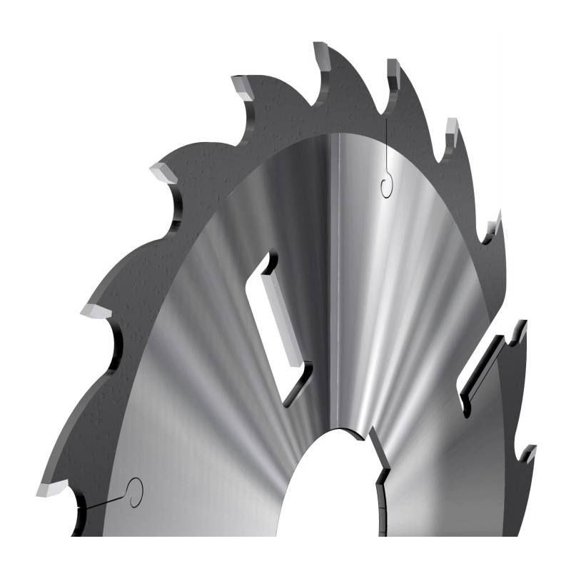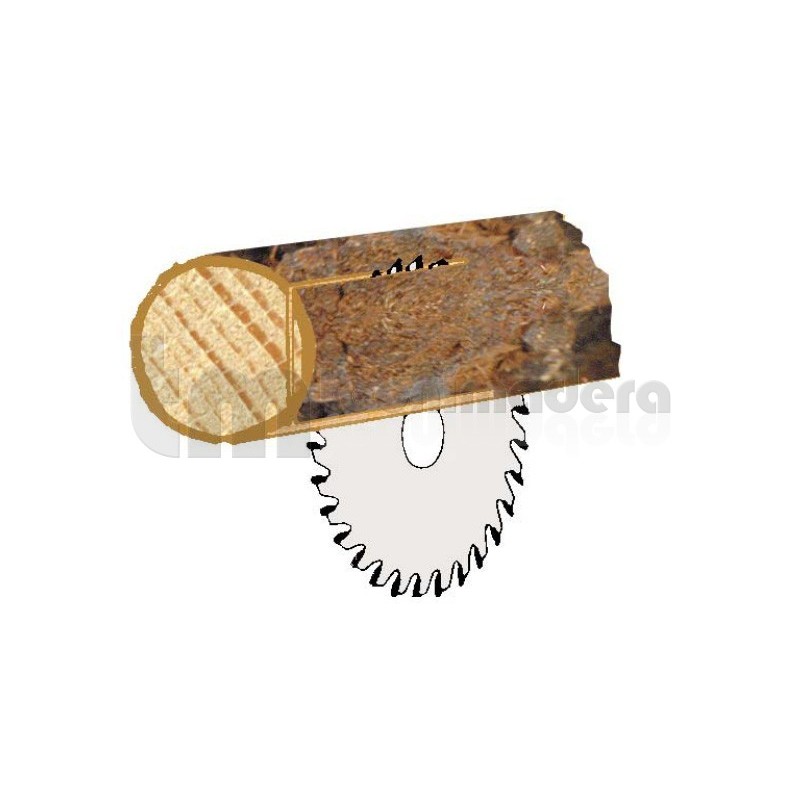 Sierra adecuada para máquina de discos múltiples, en condiciones difíciles: maderas húmedas, verdes, etc. o para los laterales al cortar troncos a lo largo (no desvía el corte). Altura de corte superior a 50 mm. Con placas centrales separadoras.