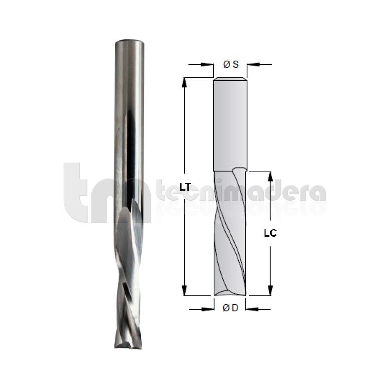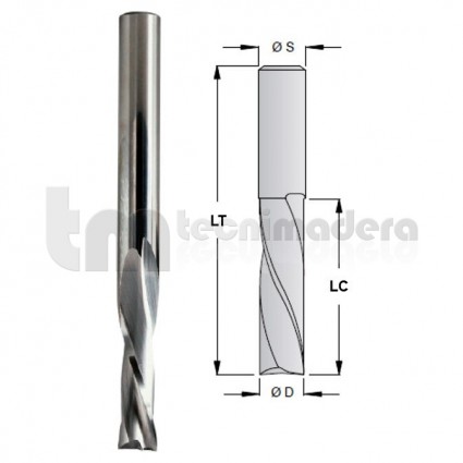 Fresa de 2 cortes (Z2), helicoidal negativo, giro derechas