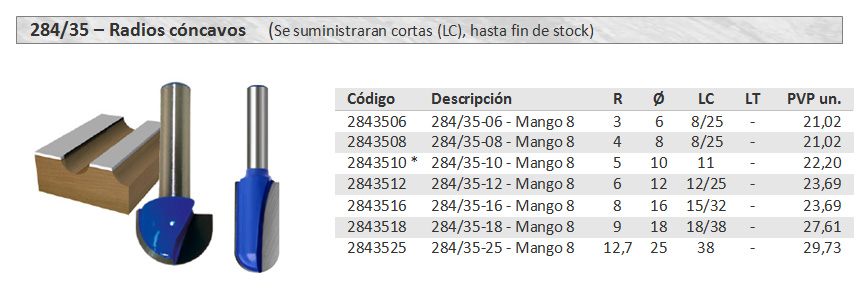 En stock Fresolines portátil 284/76 - Moldura de adorno 284/76 34,00 € 284/76 - Fresa para moldura decorativa, R= 2,5 y R= 6 mm. Ver