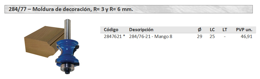 284/77 - Fresa para moldura decorativa, con copiador, R= 3 y R= 6 mm.