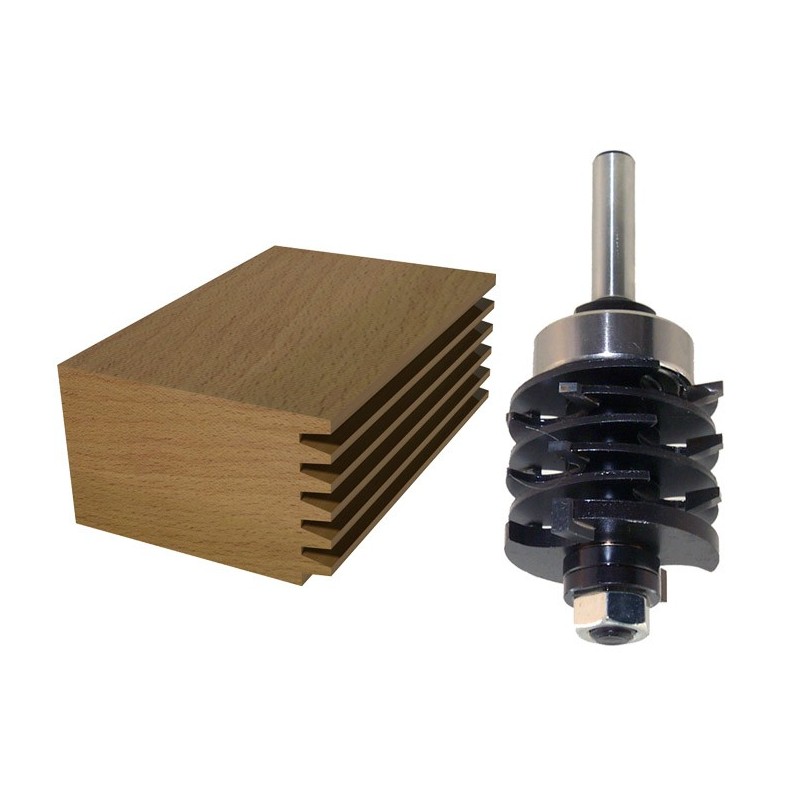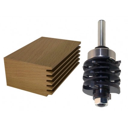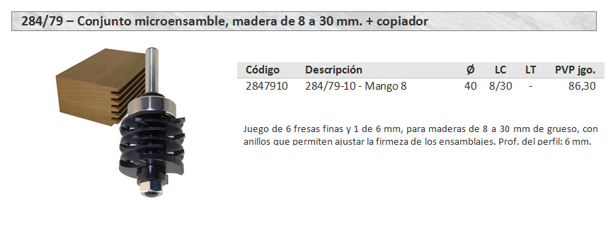 Conjunto formado por un eje con mango con 6 fresas finas y 1 fresa gruesa para trabajar maderas de 8 a 30 mm. de grueso.