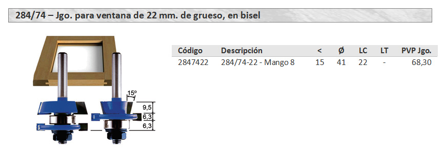 284/74 - Juego de dos fresas para realizar ventanas con bisel, de 22 mm.