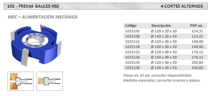 En stock Galces 104 - HSS galces, Z4 alternos y V2+2 Utillajes Boy 104 164,88 € Fresa Ø 140 x 50 eje, para galces, con 4 cortes alternos (2+2) y 4 precortadores (2+2)Para realizar galces en maderas blandas, a lo largo o a través, con acabado perfecto. Ver