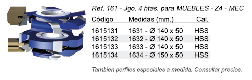 Juego 4 fresas de 4 cortes de HSS, 50 eje, para molduras y contras.