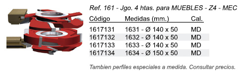 Juego 4 fresas de 4 cortes de MD (Metal Duro), 50 eje, para molduras y contras.