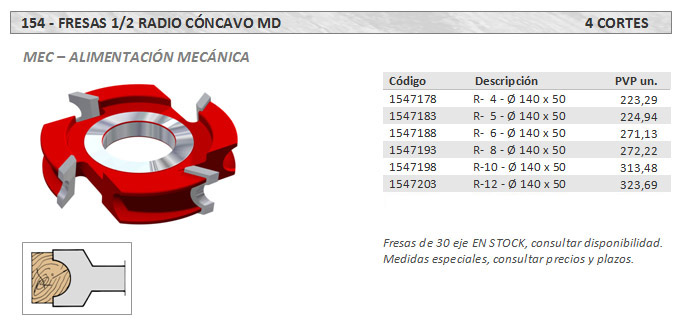 Fresa 1/2 radio cóncavo, 4 cortes, MD (Metal Duro)