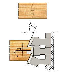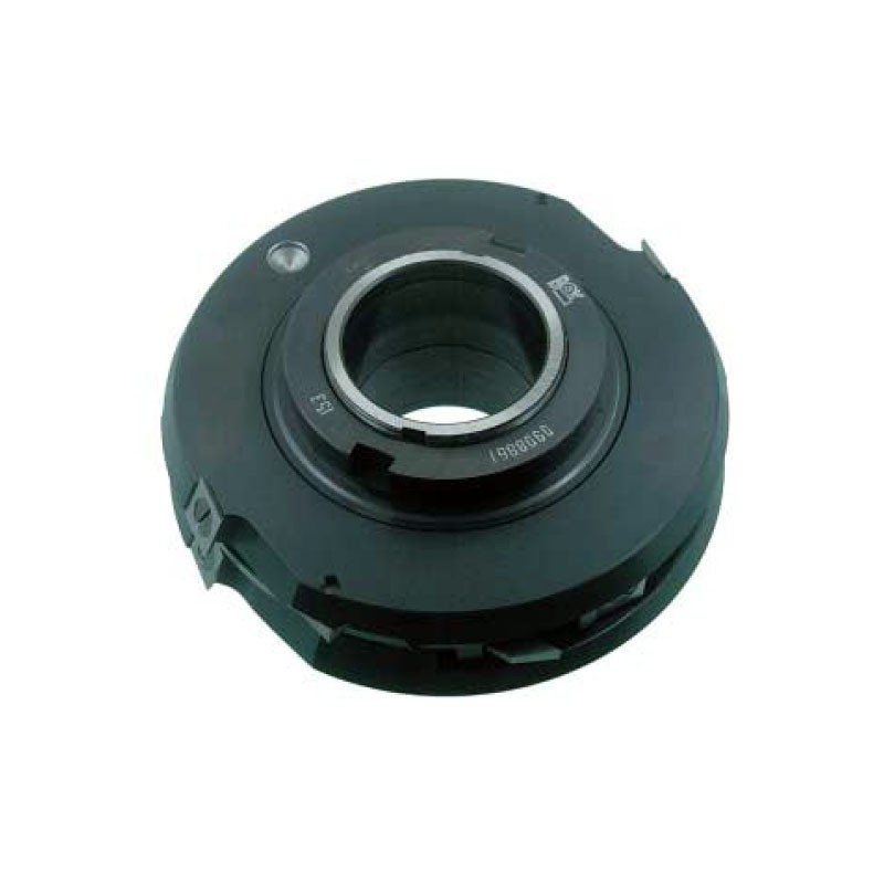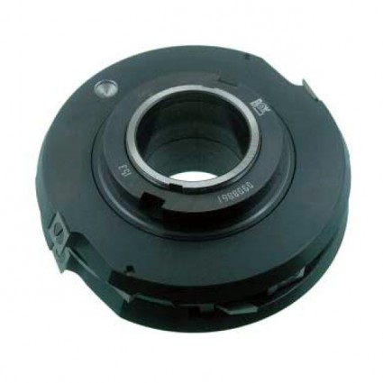 Conjunto de 3 cabezales de 2 cortes + complementos, montados en bloque a 50 eje, para juntar tablas longitudinalmente. Equipados con cuchillas de Metal Duro normalizadas.